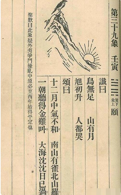 ![]() 而在图中我们可以看到,一只大鸟站在山峰上,头向着太阳的方向,而太阳在山脚下。 关于预言是这样解释的:鸟无足、山有月,那这鸟什么时候无足呢?这一是在鸟巢的时候,二是飞翔的时候,而山有月呢?这个则代表了夜晚,但在图中却看到的是鸟有足、山有日,那这是不是意味着鸟是在夜中飞行的,昼夜没什么分别。 那这是什么意思呢?这个在下一句给出了答案,旭初升、人都哭,我们把这个旭字分开可以得到,一个九和一个日,我们再来看看对应的那张图,这个旭子和图是不是非常吻合,九日就代表了九个太阳初升,这样一来自然会昼夜不分。 而这么多太阳一起升起,照耀大地,会给这个世界带来什么?我能想到的只有后羿射日。 下面我们再来说说颂曰:十二月中气不和,意思就是:升降功能失去调和,也就意味着乱,南山有雀北山罗,讲的是鸟类的迁徙紊乱了,那什么能让鸟的迁移紊乱呢?这会不会就是我们前面说的九日初升呢? 第三句:一朝听得金鸡叫,这里的金鸡就是金乌了,而乌鸦一叫能有好事吗?最后一句:大海沉沉日已过,在后羿射日中,金乌是从海中出生的,这就是大概的意思了! 总之就是灾难即将到来,那么这些灾难有具体是什么呢?我们在总结一下,九个太阳从海中生起,这会导致气节紊乱、昼夜不分。 如果我们把这些放到现实,九个太阳升起那还有点扯,可九日不一定仅代表太阳,那会不会是火山,要知道今年的全世界各地的火山似乎都不太稳定,先是汤加火山再是意大利埃特纳火山,还有日本的富士山,也有没有可能是九个国家,或是说九股撼动一方的势力呢? 不过据传《推背图》是民国时期一无聊道士杜撰出来的劣书,真假不知。 看上面众多“预言”大多数都不曾真的言中,更多的模棱两可,只要沾一点边,怎么理解都成,类似于三人全部考上,就是“无一不中”;有一个人考上,一根手指意思更明显了;二个人考上,就是“有一人不中”;三个全没考上,就是“一个不中”。。。这些我们只当玩笑看看就好,还是相信科学比较好。 |