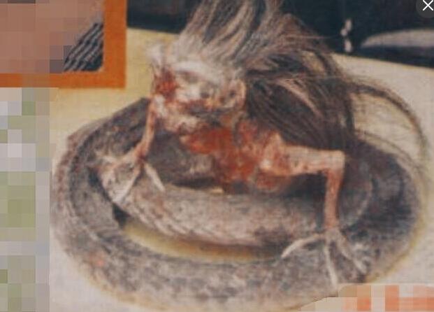 网络中流行一个图片,说是在一个女娲庙中发现了女娲真身的遗骸,根据照片显示,此“遗骸”看上去真的是人头蛇身,而且有着长长的头发,虽然和影视剧中美艳的女娲形象有着巨大差距,甚至还有些吓人,但确实和传说中的女娲形象有些相似之处。