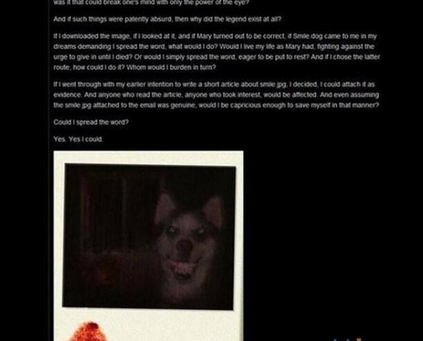 但多看几眼后,就会发展这样图PS痕迹明显,甚至手法拙劣,网络还流传着各种版本的微笑狗,甚至还说因为很多人因为看了该图死掉了,产生各种幻觉的,夜不能寐的,因此被列为世界十大禁止恐怖照片。