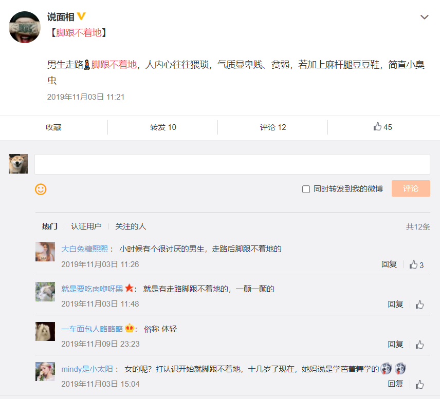 ![]() 人们在刚出生的时候,是不会走路的,所以走路姿势都是后天训练的,因此每个人的走路姿势都不一样,不过大体上也就分为几种情况,一种是脚后跟着地,一种是踮着脚走路,那么这个说法是怎么来的? ![]() 我们都知道脚上有很多人体大穴,也被称为人的第二心脏,所以脚和人的健康息息相关,而脚跟不着地走路,就会让人觉得轻飘飘的,好像站不稳似的,因此被看成是体弱的表现,古人就会认为是短命之相,再加上传闻中鬼都是踮着脚走路的,所以这种走路方式也被认为是鬼附身了,一般被鬼附身的寿命都不长,所以脚跟不着地走路才被称为短命相。那么脚跟不着地的原因有哪些? ![]() 不过现代人对于这种说法并不相信,很多人脚跟不着地走路,是因为个人习惯,每个人的走路姿势都不相同,所以这样走路的人并不少,还有一种可能是因为足部出现了病症,比如说足部畸形、外伤引起的病症,都可能会出现脚跟不着地的情况,还有一些脑损伤患者也可能会出现这种情况,需要专业人士进行分析判断。 ![]() |