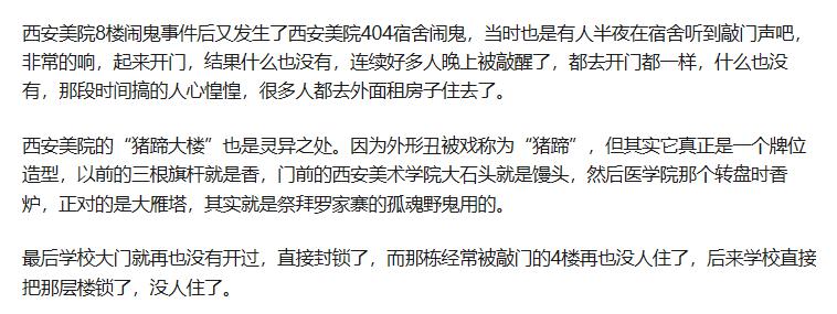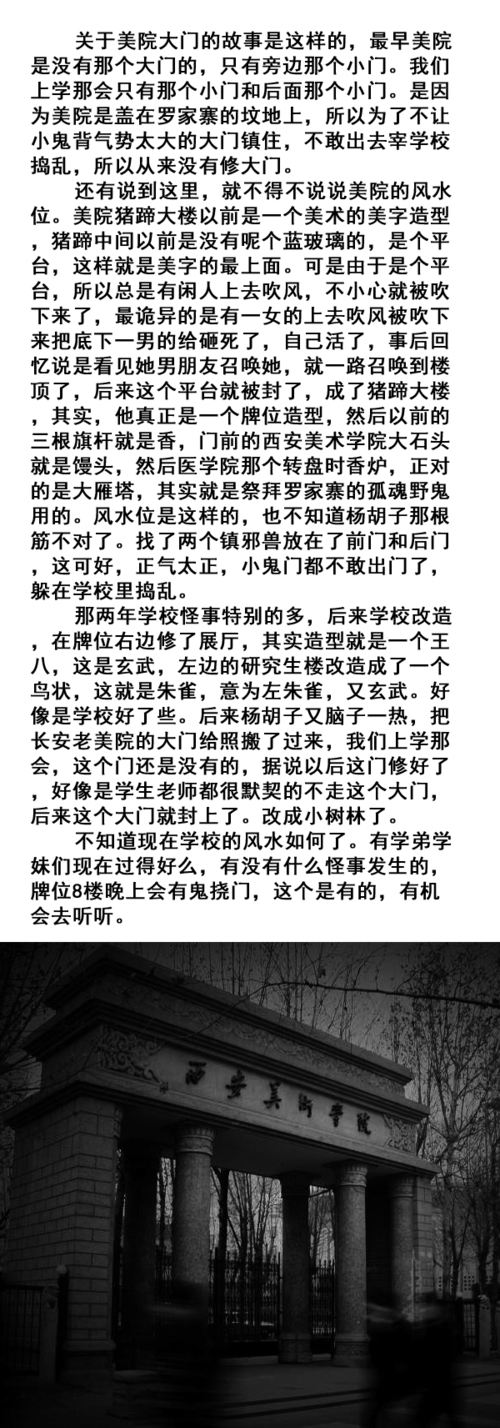 西安美院真实灵异事件探秘, ![]() ![]() 据说是因为西安美院的大门开的不好,导致校园里面频繁的发生闹鬼事件,所以学校大门也是不会打开的,而一旦打开大门,那就必然会有一些灵异事件发生,最诡异流传最多的就是西安美院八楼的闹鬼事件了。 ![]() 这些灵异事件版本和后续那是层出不穷,甚至还有延伸事件,宿舍404也出现了鬼怪敲门的事件,还有那个外形形似猪蹄的“猪蹄大楼”,灵异程度也不弱,还隐隐有后来居上的意味了,据说这是一个牌位造型,三根旗杆是三炷香,西安美院的大石头就是上供的大馒头,感觉这对待鬼物的态度是不是太敷衍了,就馒头做贡品吗? ![]() ![]() 其实吧,探索啥呀,哪个学校没有灵异事件,还有比这更传神更恐怖更真实的呢,学生嘛,本来就是处在迷信与科学中间线的无知少年,这个时候的孩子好奇心旺盛,身体素质最强,八卦之心最盛,本来小小的鬼故事都能给传成真实的大鬼入侵,要不枯燥的学业,旺盛的精力,到哪儿找好玩的消遣呢。 ![]() 这里的俯视图非常灵异 ![]() 照片来看,西安美院也的确具备灵异事件场所的必要条件,门前那么多树,有点阴森茂密了,而俯视图吧,看起来也很大很空旷,树木高大还成片成片的,这就使得整个校园显得非常阴暗,会让人觉得透心凉,心惶惶的。 |