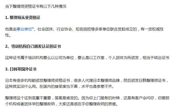 目前来看,一次整理师服务需要做的事有:“前期调研、规划方案和上门整理”。 ![]() 在2021年初,国家人力资源和社会保障部刚刚在“家政服务(4-10-01-06)”职业下增设“整理收纳师”工种,现在整理师是经过认证的职业工种了。不过目前尚未有国家机构进行专业的资格证考取服务,大部分整理师资格证都是个人机构给办法的结业证书,当然,目前日韩有专门的这种整书的认证机构,如果你有实力可以去日韩获得这种证书。 ![]() |