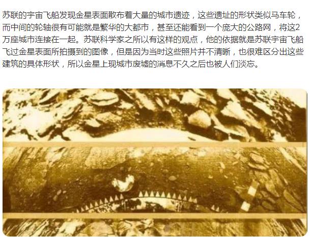 早在上个世纪70年代,科学家就在金星的大气中发现了氨,并且认为这种氨来源于生物,而不是非生物(比如闪电和火山)。其实生命的形式应该是多种多样的,浩瀚的宇宙中存在着其它生命,或其它生命形式都是有可能的。如果我们人类只是以地球的声明形式来探索浩瀚的宇宙,那么无异于“刻舟求剑”,应该发散思维,大胆想象,以此来探寻浩瀚无边的宇宙。 ![]() 曾经,网络上有个文章是说:前苏联一艘无人船在那里拍下了一组惊人的照片显示,大约2万个城市曾建立在星球上。这些城市散布在金星表面,但都是倒塌的状态。