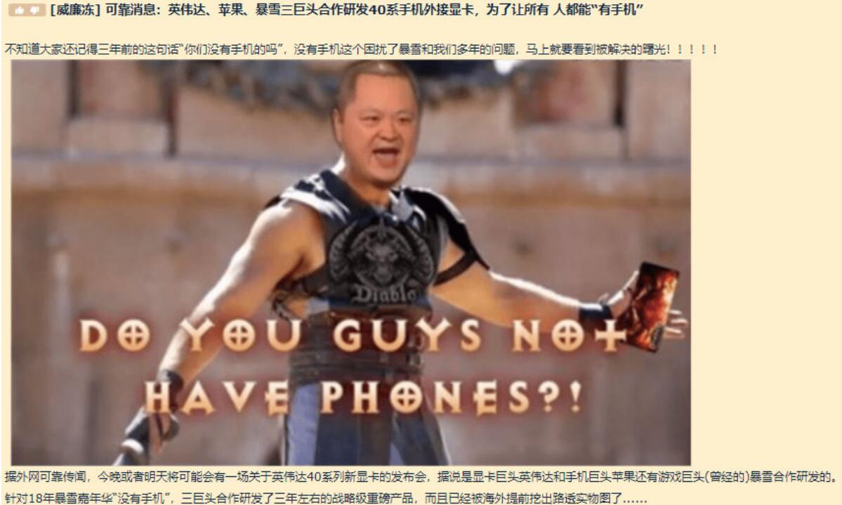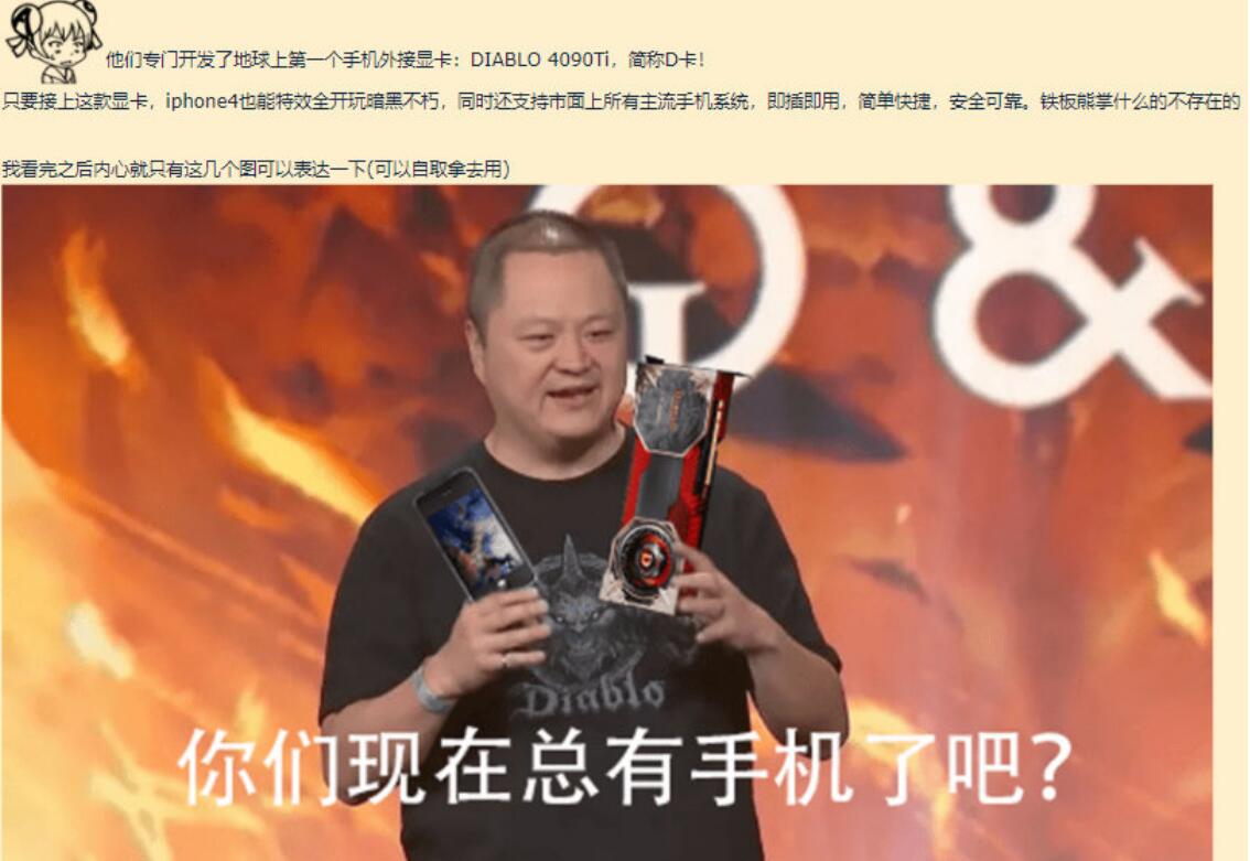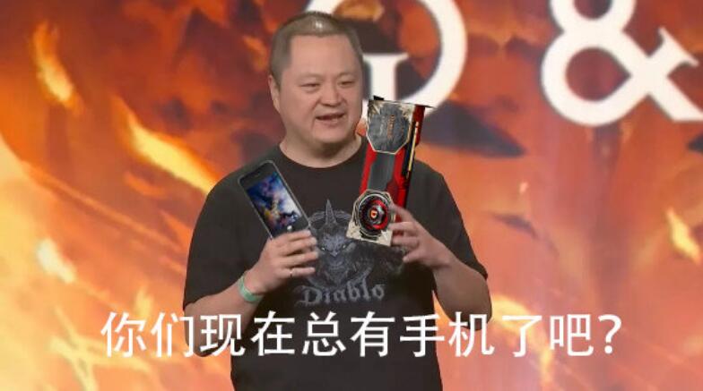这就是针对暗黑手游研发的手机外接显卡。为了回应2018年暴雪嘉年华“你们没有手机吗?”目的就是让全世界没有手机的玩家都能顺畅的玩到暗黑不朽手游,甚至支持市面上所有主流手机,就连iphone4都可以特效全开,刚好暗黑不朽手游在前几天开启了苹果预约,似乎即将就要公测了,可以说是时间点恰到好处,不得不说真的是一场游戏界的革命壮举啊。这个消息被玩家传来传去,衍生出了无数梗图。