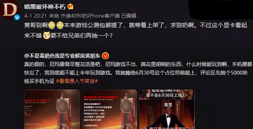 不过大家要注意的是4月1号是愚人节啊!!虽然目前不知道是暴雪放出的愚人节玩笑,还是网友恶搞,但是自黑精神是深入人心。暗黑手游官博一下场自黑回应,真的不说这个显卡外形设计的还是很不错的,啥时候真的安排呀?