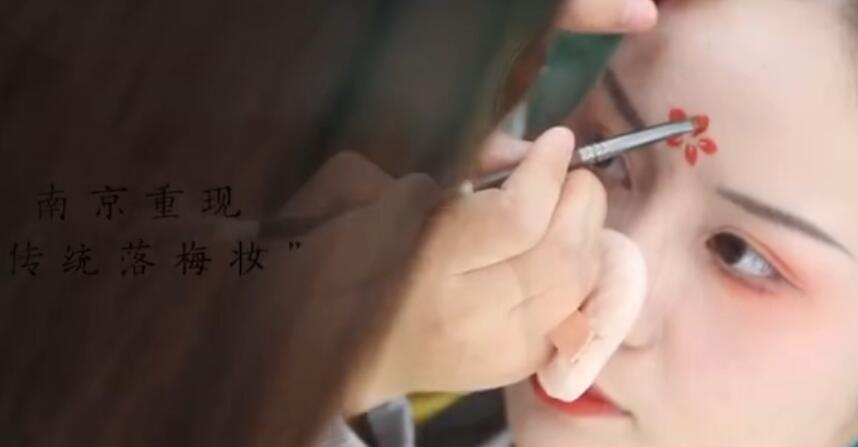近日,南京重现传统落梅妆引得不少国风达人组团打卡。根据视频画面来看,所谓的“落梅妆”就是在女性的额头点缀美丽的梅花或者其他花瓣样的装饰,“艳如美人痣, 原是落梅妆”。这款装饰在宋代便有,很多诗人曾经用诗歌的形式描述过“落梅妆”,比如:黄庭坚有词“玉台弄粉花应妒”,王禹有诗“自当羞见落梅妆”。