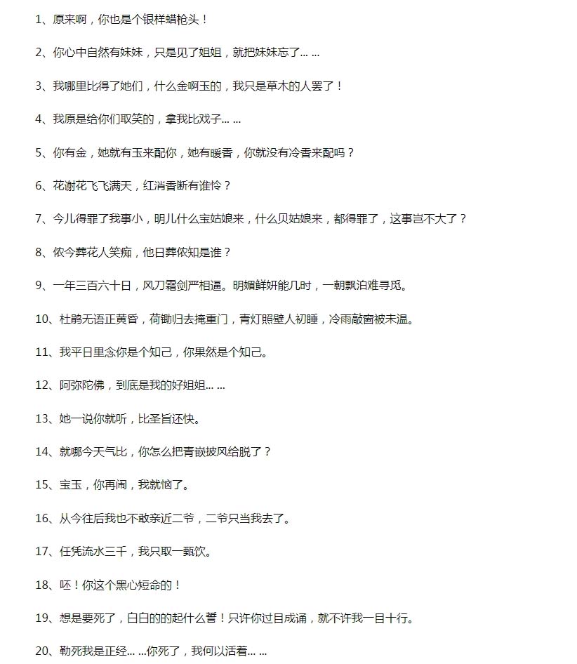 《红楼梦》的作者在文中塑造出了众多有血有肉的个性化人物形象,仅有名有姓的就多达四百八十多个,其中作为金陵十二钗之冠的林黛玉就给人留下了深刻的印象。林黛玉说话总会让人感觉阴阳怪气的,那言如其人,率真的“林妹妹”都有哪些阴阳怪气的语录呢?下面就让我们来大体总结一下。第8回中黛玉曾说“早知他来,我就不来了。”19回中“蠢材!蠢材!你有玉,人家就有金来配你;人家有“冷香”,你就没有“暖香”去配?”还有黛玉冷笑道:“我就知道,别人不挑剩下的也不给我。”从这些话中我们都能感受到林黛玉的话中有话,类似的还有很多,朋友们可以去书中查看,在此就不做更多的列举了。 ![]() 继续再来看一些 林黛玉作为《红楼梦》的“女一号”,大家都知道林黛玉的身体一直不好,在封建社会时医疗条件是不行的,所以林黛玉年纪轻轻的就香消玉损了。但是人们一直有个疑问,就是现在来看林黛玉究竟得的是什么病呢?网上也有好几种猜测,有人说是肺结核,但是跟林黛玉的病有典型的冬、春季节会加重这一特点不符。也有人说是过敏性哮喘,但是林黛玉的父母、兄妹中有多人都是较早夭亡,所以这个病有着明显的遗传特点。所以目前看来,林黛玉的病最靠谱的猜测应该是先天性心脏病,确切的说是左心功能不全,所以林黛玉在进入贾府以后,她的病情是一直在变化加重的情况,而且她临死前的症状也跟心脏病是相符的,所以才有了专业医生给出的林黛玉得的是先天性心脏病的说法。 ![]() |