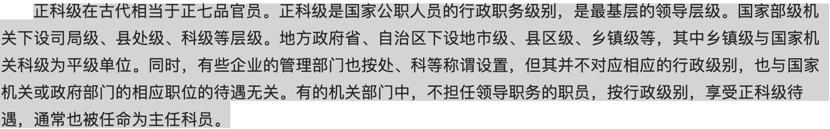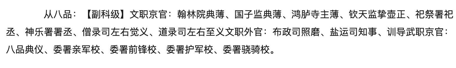 知县在中国历史上,是最基层的官员,在知县之下的官职,就不能称为官,而是称为“吏”,这是两个差距很大的阶层,知县的品级是七品,作为一方父母官,知县手握一县的军、政大权,这在现代社会,是根本不可能存在的,那么七品知县相当于现在的正科级吗? 对于正科级的解释,一般有两个意思,一个指的就是国家公职人员的级别,另一个指的是政府机构的级别,而政府机构的级别依次分别为国家级、省级、厅级、县级和科级,所以从政府机构来说,正科级在古代在七品官以下,一般都是八品官。而从公职人员的级别来说,正科级是最基层的领导级别,因此和知县有很多相似之处,因此也可以说相当于古代七品。那么副科级是古代几品官? 而副科级在正科级以下,算是国家公职人员的级别之一,不过副科级大都不是领导职务,而是有所在部门决定的,所以副科级只是公务员级别,甚至算不上是领导干部,在古代官职中,一般认为副科级是从八品官员,比如说主薄之类的官职。 ![]() |