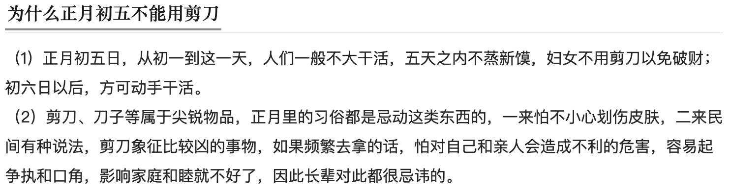![]() 正月初五一直有“破五”的说法,意思是这一天“破五穷”、“赶五穷”,也有“送年”的意思,而所谓的五穷,指的是智穷、学穷、文穷、交穷和命穷,不过关于赶五穷的来历,民间也有很多说法,比如说姜子牙的妻子之说,看过《封神榜》的人应该都知道,姜子牙有个背叛他的妻子,所以后来他封神的时候,就把背叛他的妻子封为穷神,说她“逢破必归”,因此民间都很讨厌她,所以初五的时候就“破”她。 ![]() 破五的风俗有很多,比如说把“穷娘娘”扫出门,就会给家里来个大扫除,会把家里的旧东西或者垃圾清除出去,还要焚香迎接财神,放鞭炮和吃饺子是必不可少的,有些地方在正月初五开市,意味着财源滚滚来。 ![]() 其实传统意义上的过年,指的是初一到初五这几天,在这些天中,人们是需要的放松或者享受,不能做新馒头,不能吵架,不能说不吉利的话,不能打扫卫生、动剪刀或者针线等,甚至连垃圾都不能倒掉。因为剪刀是凶器,在过年的时候用会影响家庭和睦,容易引发口角,据说用剪刀还会破财,因此才会有这种习俗。 ![]() |