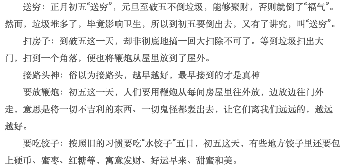 在中国的传统年俗中,初一到初五都是非常重要的日子,尤其是初五这天,有“破五”的习俗,大多数人应该都知道,初五是迎接财神的日子,一般过了初五,也就意味着过年的结束,人们恢复到以前的生活状态,那么破五的习俗一般有哪些?