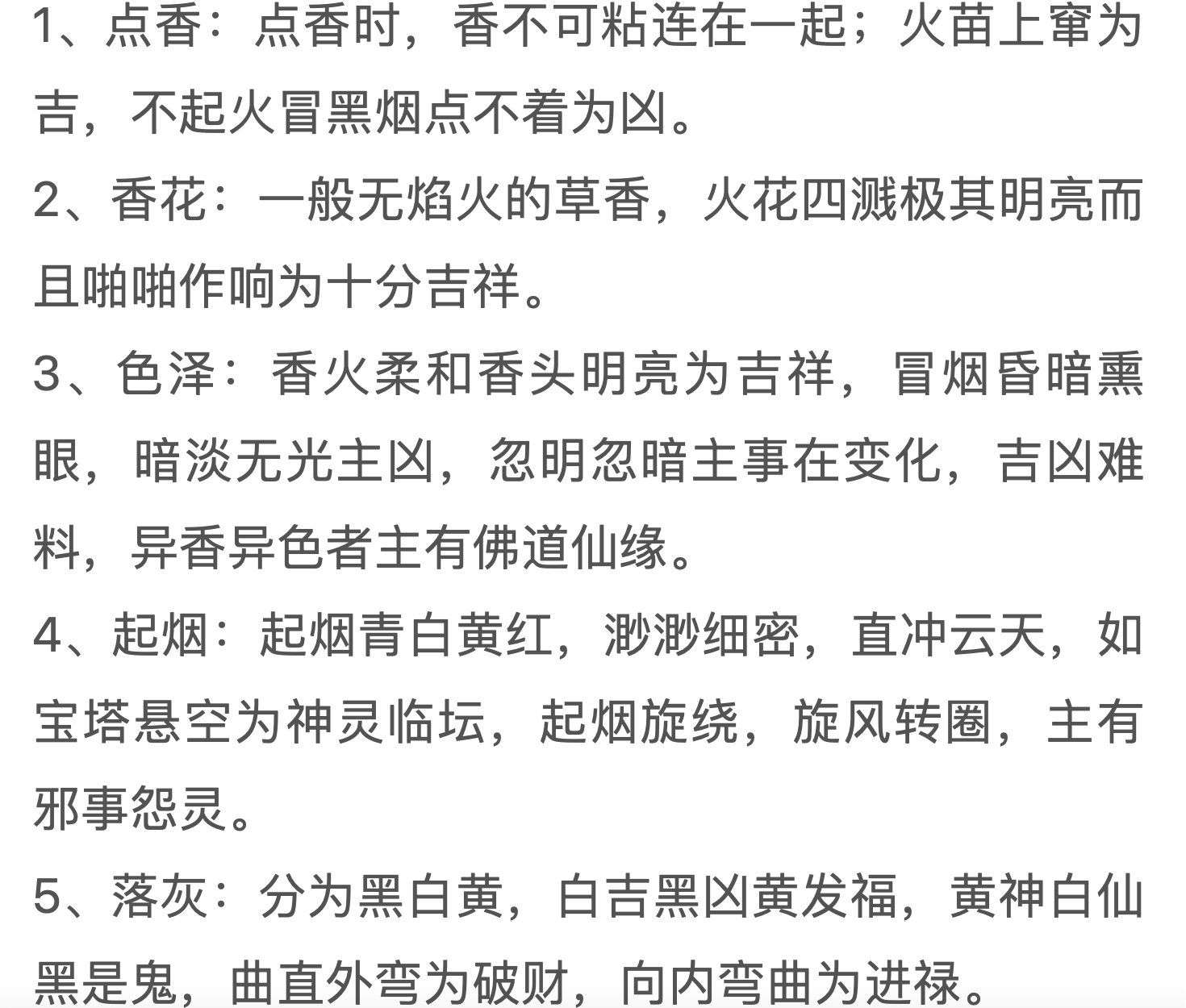 ![]() 不过人们在烧香的时候,最高是不能超过十三炷香的,所以十三炷香有圆满之意,据说“烧高香”,指的就是烧十三炷香,不过通常来说,求神拜佛的时候烧三炷香就可以了。尤其是现在,很多寺庙道观都是烧一炷香或者三炷香。 ![]() 民间传说三根香长短不一样寓意 在一些传闻中,三炷香燃烧时长短不一也是有不同的说法的,第一种叫做平安香,就是香的长短始终保持一致,第二种叫做禄香,左边的香比右边高,但是又低于中间的香,预示着官运会发生变化,第三种是大、小天真香,香左右持平低于中间,意思是神仙降临,第四种是大、小莲花香,这种香一般是两边的高于中间的,意思是近日会有好事发生,第五种香是催命香,就是左边和中间的齐平,右边的低于两分之一,意为近日可能会受伤或者丧命,这种香是凶兆,还有一种香孝服香,就是右边的香略短于另外两只香,意思是最近家中会有丧事。 ![]() 三根香头看凶吉解说 在一些说法种,两长一短是最受忌讳的一种香,因为它意味着会有不好的事情发生,所以从三根香头上就能看出凶吉,比如说三根香头持平就是平安无事的象征,再比如说左边或者右边不一样高,有一边和中间齐平,就是寿香,左边比右边高就是增寿,右边比左边高就是减寿,这些都是有很多说法的,感兴趣的可以去了解一下。 ![]() |