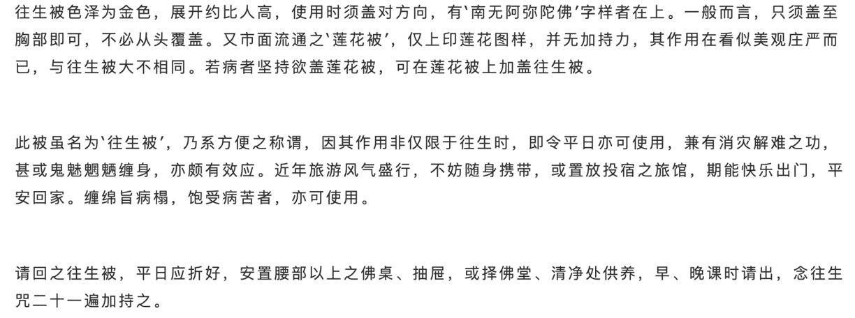 ![]() 往生被也叫做陀罗尼被,这起源于佛教,后来盛行于藏传佛教,往生被上有梵文或者藏语书写的佛教经文或者咒语,清朝时也被称为裹尸布,一般是清朝皇室成员死后用往生被包裹尸身,然后葬入陵寝中,当然也不是所有的皇室成员都能用往生被,只有亲王品级以上的贵族才能使用。那么往生被的作用有哪些? ![]() 往生被的作用和好处 据说逝者盖往生被,会使面容安详,就像生前睡着了一样,而且盖往生被,还能使其消除生前罪恶,就算是到了阴间,身披往生被也能得到特殊照顾,邪魔无法靠近,鬼神都要敬三分,因此很多人都以为,往生被只是给死人用的,其实并非如此,活人也能用往生被,能起到消除病痛,祛病消灾的作用。 ![]() 一般往生被用在活人身上的话,需要高僧加持过的,效果更佳,最好是随身携带,尤其是外出住宿的时候,也可以带着往生被,只要盖至腰部就可以,往生被大都携带方便,但是造价不菲,尤其是比较上档次的往生被,价格就会越高,有的往生被甚至被镶嵌上珠宝或者金丝制成,算是不可多得的宝贝。 ![]() 往生被活人的用法介绍 |