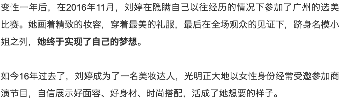 除了金星外,还有一个很有名的变性人,她的名字叫做刘婷,估计很多人都听说过她的故事,当年“背母上学”的新闻,让她一夜之间声名大噪,不过当时的她还叫刘霆,是一个少年模样,刘霆自小就认为自己应该是个女孩,所以十分抗拒自己是个男性,但因为母亲的重病,父亲的不告而别,让刘霆把这种想法压了下来。 直到后来刘霆背母上学的事情被报道后,她的母亲也被治好,这种想法就压抑不住了,后来经过检查,才知道这是一种病,叫做先天性异性疾病,经过慎重考虑后,刘霆就接受资助,做了变性手术,并且改名为刘婷,变性后的刘婷,成了一位身材高挑,面容姣好的美女,后来还参加了选美比赛,和从前判若两人,不过至今为止,还未听说刘婷结婚的消息,可能是因为她还没遇到那个对的人吧。 如今已经过去十多年了,变性人也渐渐增多,刘婷也不会受到太多异样的目光,现在的刘婷是一位美妆博主,也会参加一些时尚活动,作为时尚达人的她,活得潇洒又自信,实在是让人羡慕不已。小编觉得刘婷应该很满意现在的生活状态吧。 ![]() |