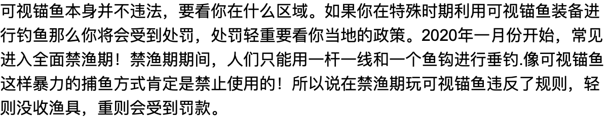 钓鱼和钓鱼之间也是有区别的,比如说有人喜欢野钓,有人则青睐海钓,但也有人选择用可视锚鱼,其实在大多数热爱钓鱼的人眼中,用可视锚鱼的人都是假的钓鱼人,而且用可视锚鱼的影响也不是很好,因此经常会出现评判这类行为的文章,那么可视锚鱼违法吗? 常见的锚鱼,就是用一种特殊的钓鱼工具,能够快速的扑捉到鱼,这种方法不但失去了垂钓的乐趣,而且容易产生不好的影响,这种钓鱼方式是很残忍的,不过正常情况下,锚鱼是不算违法的,只要不是在禁渔区或者禁渔期,锚鱼这种行为本身是不犯法的。我们都知道,现在国家对于资源环境的保护都是非常到位的,所以如果在某些水产资源保护区垂钓的话,也是违反国家的相关规定的。 如果单从技术方面进行分析的话,可视锚鱼这种技术是不违反的,但是利用这项技术进行钓鱼,就是一种违反行为,尤其是在一些禁止垂钓和锚鱼的地方使用,自然是会被追究法律责任,尤其是在禁渔期期间,使用可视锚鱼是非常不可取的,毕竟我们都知道,可视锚鱼的破坏力是非常大的,很可能会造成生物链失衡,所以这个类似外挂的钓鱼方式,尽量还是不要使用为好。 ![]() |