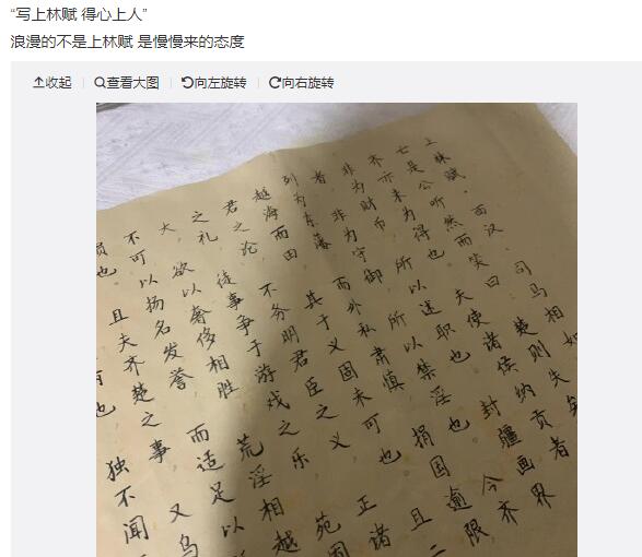“写上林赋,得心上人”的意思是只要坚持抄写完《上林赋》就可以得到心爱的人,其实《上林赋》全篇讲的是狩猎等场面,与爱情无关,但却被网友附上“真爱”的寓意,因为《上林赋》的篇幅很长,且生僻字极多,写完需要花费很多的心思,当你喜欢一个人,又不确定是不是真的喜欢的时候,便可静下来心来,为“他”抄写一遍《上林赋》,如果能坚持抄完,就说明那个人是你的真爱。