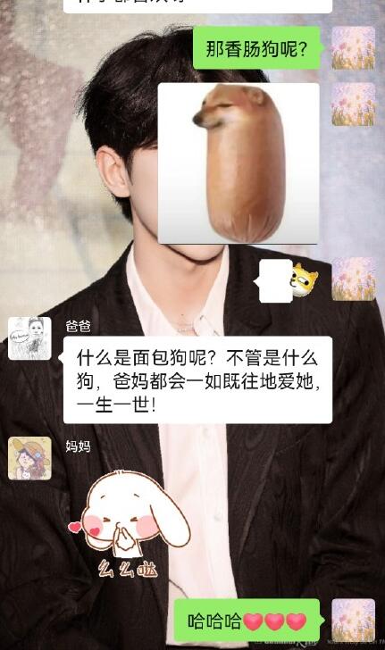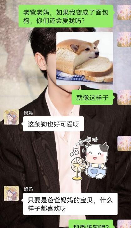 一个网友把该表情包发给了自己的妈妈,问她:假如我变成面包狗,你还爱我吗?妈妈说会的,网友又问:或者变成更丑的香肠狗呢?妈妈回答“不管你变成啥样我都爱你”之后该网友把聊天截图发到网上,引来众多网友的效仿,大家纷纷把表情包发给了自己的爸爸妈妈,问他们"假如我变成面包狗,你还爱我吗?",每个爸爸妈妈的回答五花八门,但大多数父母的回答差不多都是“不管你变成啥样我都爱你”