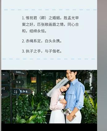 121、今日,我带着喜乐感恩的心灵,代表教会向你们致以衷心地祝愿:主作之合永恒情,情投意合爱不息;愿上帝祝福你们的爱比高天更高更长,你们的情比深海更深更广!