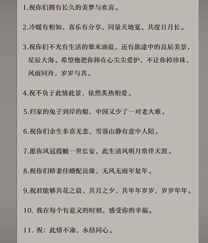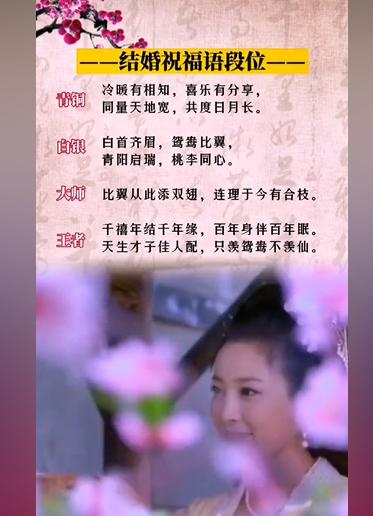 十年修得同船渡,百年修得共枕眠。于茫茫人海中找到她,分明是千年前的一段缘,祝你俩幸福美满,共谐连理。 兄弟姐妹们,让我们拭目以待,且看淑女变佳妇,从此奇男成丈夫。 结婚祝福语高级一点的盘点 ![]() 兰舟昨日系,今朝结丝萝,一对神仙眷侣,两颗白首同心,今宵同温鸳鸯梦,来年双飞乐重重,新婚同祝愿,百年好合天与共。 ![]() 两姓联姻,一堂缔约,良缘永结,匹配同称。看此日桃花灼灼,宜室宜家,卜他年瓜瓞绵绵,尔昌尔炽。现谨以白头之约,书向鸿笺,好将红叶之盟,载明鸳谱。祝哥哥嫂嫂白头偕老,永结同心。 红叶传书,锦屏射雀,终成秦晋之好于斯日。白头偕老,鸿案相庄,愿结琴瑟之欢于永年。 纵山高不阻其志,涧深不断其行,流年不毁其意,风霜不掩其情。纵然前路荆棘遍野,亦将坦然无惧仗剑随行。今生今世,不离不弃,永生永世,相许相从。 |