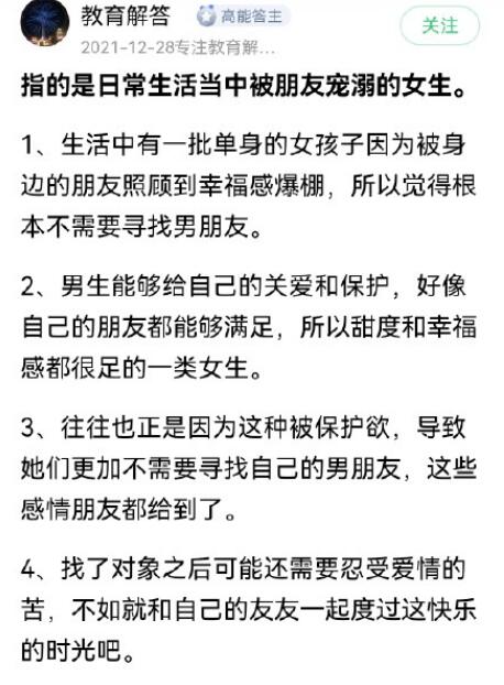 “友宝女”是指的平时被身边的朋友各种宠溺,男友能给的关心呵护,朋友都能给,觉得有了友情自己甚至可以不需要爱情,想永远就以这种状态生活下去。