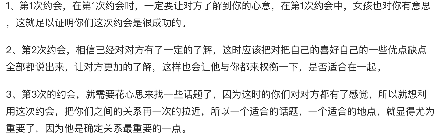 ![]() 两个不太熟悉的人,只有在一次又一次的相处中才能增进了解,因此在约会的时候,男女双方都会仔细的观察对方,试探有没有在一起的可能性。有一种说法叫做三次约会定律,就是说约会三次之后,大概就能看出对方是怎么的一个人了,那么这个说法靠谱吗? ![]() 第一次约会的时候,女生应该是处于主导地位的,如果女生不满意的话,就不会有第二次约会,所以初印象是非常重要的,第二次约会说明双方都对彼此很满意,但这种好感是很薄弱的,需要更进一步了解,到了第三次约会,说明双方都有进一步发展的想法,是能否确定交往的最关键的一步,这就是三次约会定律。一般三次约会后,主导权就会有男生占据,想要终止于朋友还是更进一步,就看男生的表现了。 ![]() 在经历过三次约会后,男女双方对彼此都有了一个大致的了解,而且可以从彼此的交谈中,看双方的三观是否契合,所以三次约会定律还是有一定道理的,所以听起来挺靠谱的,但我们都知道,一个人其实都有多面性的,三次约会就看清一个人,是不太现实的,所以到底如何选择,还是要看个人的选择。 ![]() |