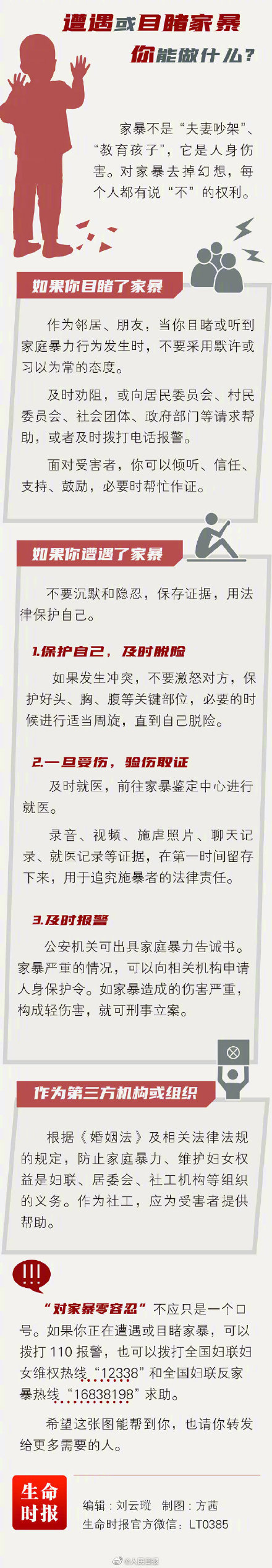 家暴男为什么这么嚣张?当然是拿捏了妻子的“沉默”和不愿意反抗,上面“王某飞”的岳父岳母,以及妻子为了孩子,都选择了容忍王某飞的家暴,这种行为实际上给王某飞壮了胆。 家暴男最怕妻子不再沉默,拿起法律的武器来维护自己的权益,那么遇到或者目睹家暴,你能做什么?下面这些建议或许对你有帮助! ![]() |