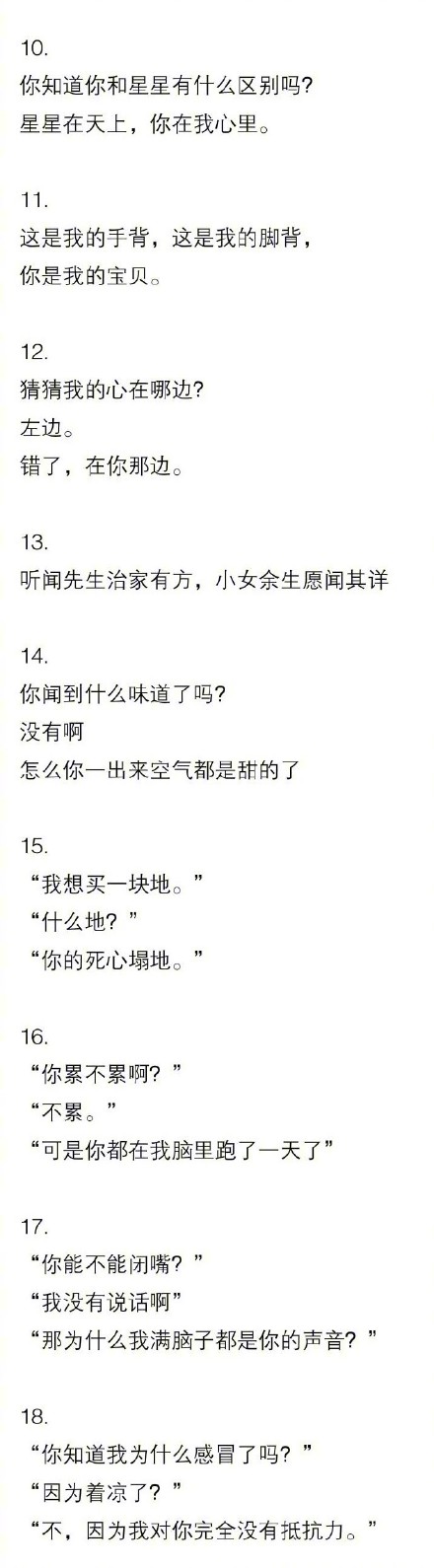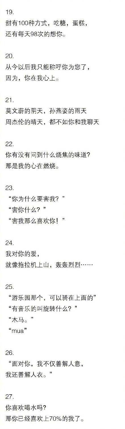 现在市面上直男太多,情话逐渐被大家遗忘和抛弃,似乎这样的男生才值得托付终生,都快忘了男生们撩妹子的绵绵情话了,情话是世间最迷人的话语,是初初爱情的催生剂,是滋养心灵的灵泉水,是平息争吵的柔化剂。所以会几句情话是非常必要的,来点撩妹子的情话套路给大家吧,撩妹子的绝招聊天套路大全。