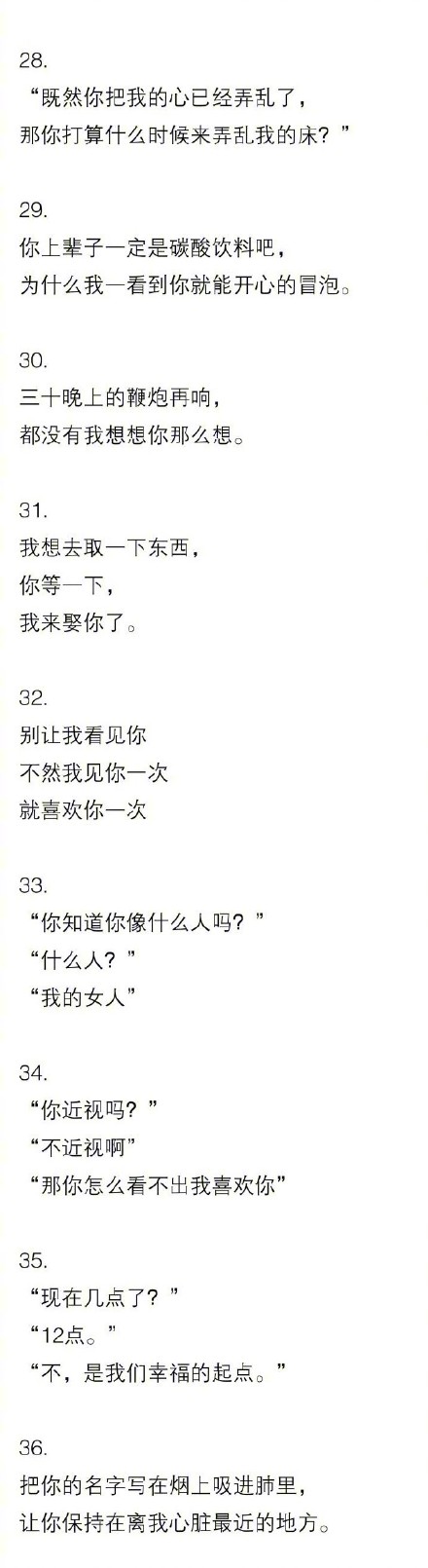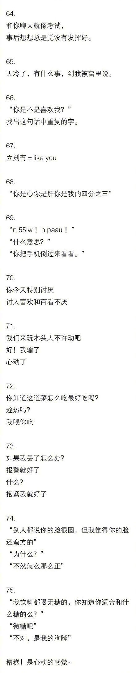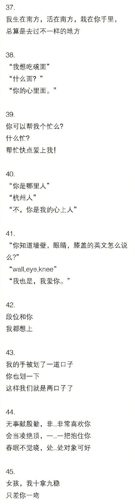 撩妹子的情话套路, ![]() ![]() 撩妹子的情话套路很多,最重要的用心,要出其不意,反转不断,温暖渗透,不经意间撩拨对方,让对方会心一笑,小鹿一撞,爱情就来了。 ![]() 问你个问题 嗯,你问 一年三年六十五天,你猜猜我最喜欢哪一天? 不上班的那天 错 那是? 我最喜欢跟你聊天。 ![]() ![]() 有时候情话套路有点像土味情话带着点反转,但是要注意如果对方不是已经确定的对象或者是很反感土味情话的,就不了轻易发土味情话,情话套路也要尽量避免土味,避免油腻,避免无聊,最重要的是避免说些会用对方反感的话。 ![]() 最近看手机有点眼睛疼。 那你为什么还看 因为我想透过手机看到你啊。 ![]() 你喜欢喝水吗? 喜欢啊 很好,你已经喜欢上70%的我了, 啥意思 因为人身体里70%都是水呀。 撩妹子的绝招聊天套路大全 ![]() 撩妹子绝招大体上都是一种套路,最好是一问一答,这样吊起对方的兴趣,让对方跟着你的问题想一想,最后动心一笑,就算是成功的撩妹绝招了,而对方笑了之后不反感,基本上爱情就成了。 ![]() ![]() 昨晚上梦到你 梦到我什么 梦到我喜欢上你了 老套 但是现在醒来发现梦是反的 你到底想说什么 我想说,反正我都喜欢你。 这撩妹情话说的,表白也表了,可爱也可了,爱情大概率是也成功了。 |