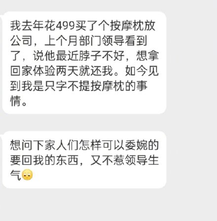 当然也有很多网友提出了不同的解决方案,举个例子,下面这个网友自己的按摩枕被领导借走了,不知道怎么开口要,网友们给出了很多方案: ![]() Pluff_er : 就说淘宝卖家说按摩枕有问题 需要统一回收换货 哈卷西安分卷 : 你看天上那个弯弯的月亮,像不像一个按摩枕