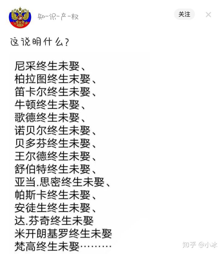 对于智者不入爱河这句话的下一句,网友们也纷纷展示自己才华,对对子,下面是网友给对出来的下一句: ![]() 此外,在历史上,很多“智者”,牛逼的科学家们,确实没有坠入过爱河,一生未娶,根据不完全统计,下面这些大家们,都没有结过婚。 ![]() |