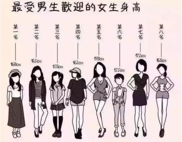 女生首先映入在大众面前的是她的身高,其次才是长相、五官、性格等等,一个女孩的身高在很多时候影响她的很多方面。艺考、相亲、工作等很多的方面,一些比较专业的院校(军校、空姐)都会对女生的身高有一定的要求。在我国12年的做过一个调查18周岁男女的身高平均是167.1、155.8相对而言女生的身高不是很高,近几年经济发展父母对孩子营养搭配也开始重视升高指数也上涨了,当时流行的一句话“今天你达标了吗?”,成为人们争相比较的标准。现在160的女生越来越多,她们和多高的男生最相配呢,女生的身高多高当下最受欢迎。