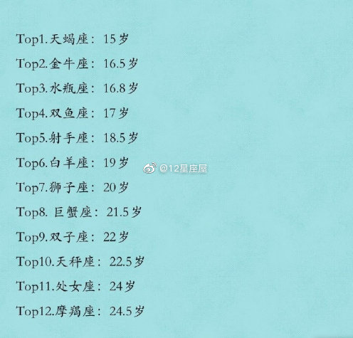 初吻,也就是第一次跟恋人接吻,一般来说,你谈了情侣朋友,并有了第一次的接吻行为就算初吻,普通朋友之间亲一个、爸爸妈妈亲你一下,都不算是初吻。初吻一定是相对于恋人而言的,并且是两情相悦的主动的,被强吻个人觉得不算初吻。一般来说,上了初中之后,男女之间开始有了内心的蠢蠢欲动,会出现孩子的早恋现象,这个时期的接吻,都算是初吻,这个时期的少男少女们的普遍年龄在15岁左右。但是现实中,大部分人的初吻年龄都会保持在20岁以后,下面是星座达人给汇总的不同星座初吻的年纪,看看你的星座是多大?