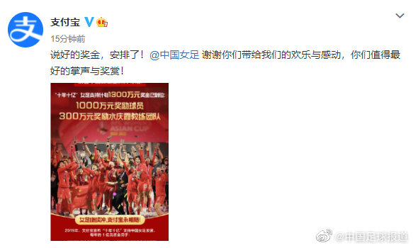 中国女足给憋气的中国足球带来了曙光,让不少球迷从“大年初一的噩梦”中看到了希望,2月6日,中国女足3-2战胜韩国女足,夺得亚洲杯冠军。女足亚洲杯决赛,半场0比2落后。是不是就此放弃?中国女足的球员们没有,坐在主教练位置上的水庆霞,更没有。这就是中国女足精神!赛后,黄健翔建议“足协请按照男足奖金标准双倍给女足发奖金!”,而蒙牛、支付宝等公司也纷纷慷慨解囊,蒙牛给予中国女足1000万元现金奖励;支付宝兑现承诺,官宣给女足1300万奖金,其中1000万奖励球队,300万给水庆霞教练团队。