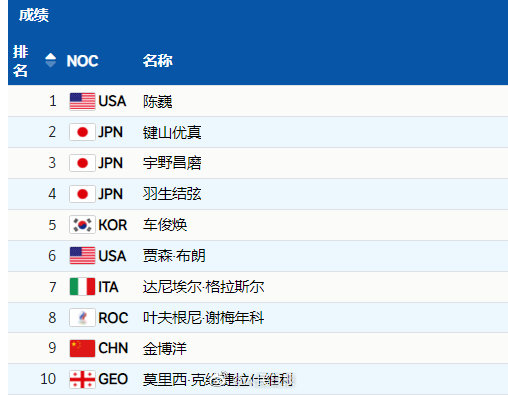 在北京冬奥会花样滑冰男子单人滑自由滑比赛中,美国选手陈巍金牌,日本选手键山优真银牌,宇野昌磨铜牌,羽生结弦无缘奖牌,中国选手金博洋第9。这是一场精彩纷呈的比赛,祝贺他们! 陈巍(Nathan Chen,网友喜欢称呼他为NC的由来,不错NC在互联网世界还有其他的意思),1999年5月5日出生于美国犹他州盐湖城,美籍华裔花样滑冰运动员。