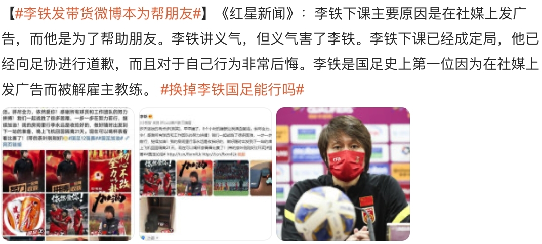 ![]() 这么多年,人们一直在为男足的失利的找原因,其中有说是球员水土不服的,说教练不行的,还有说足协主席的,但人们发现,这些都是最表面的原因,中国男足就像扶不起的阿斗,球员们本身就没有进取之心,尤其是在比赛失利后,很多人又想起了前段时间下课的李铁,觉得应该重新请他回来,但李铁下课的根本原因,成绩并不是重要原因。 事情的起因,要从十二强赛结束时说起,当时还是国家队主教练的李铁,在赛后的记者发布会上,花了很长时间来讲述他执教以来的困难,对于失利原因,并不认为是他自己的责任,而且他口无遮拦,几乎得罪了所有的球迷,其中的导火索就是广告事件,这也是导致他下课的直接原因。 在球迷们和李铁的口水战白热化的时候,李铁却在微博上为一些品牌做报告,p掉了国足赞助商耐克的标识,反而植入了他代言的李宁和某款茶叶等,在这时候,李铁还被爆出以国足主帅的身份谋取私利,在任男足主教练时,还兼职武汉卓尔,据说和某个经纪公司交往密切,这种公器私用的行为,才是球迷们愤怒的原因,也是李铁下课的导火索,所以李铁卸任主教练,并不是只是因为成绩,还因为他的个人原因。 ![]() |