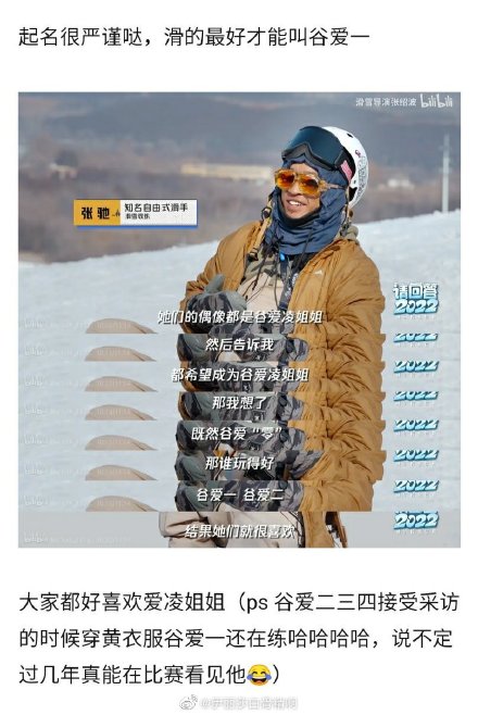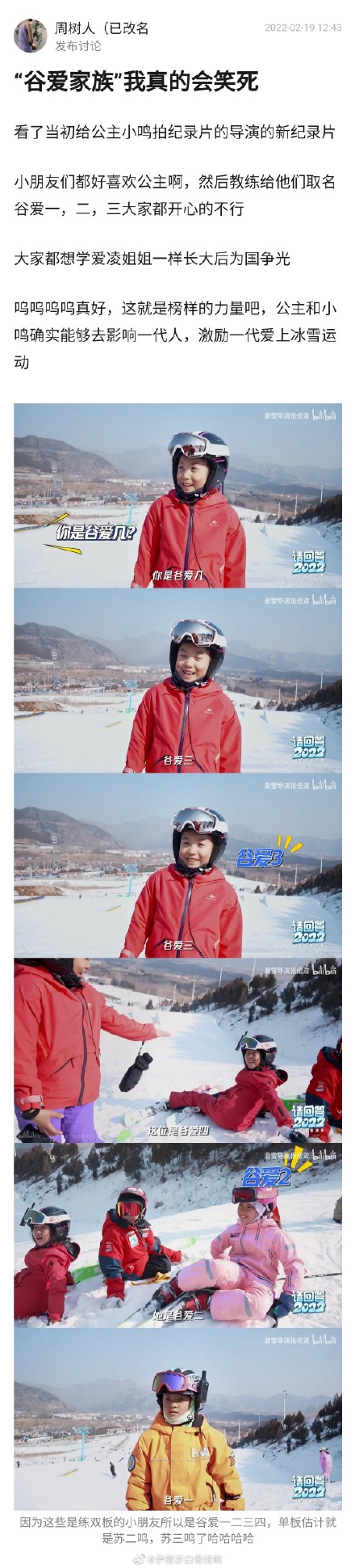 在综艺《请回答2022》中,我们知道,在神奇的冰雪世界中,有一个谷爱家族,这些家族里面的小朋友们都特别喜欢谷爱凌,他们以谷爱凌姐姐为目标努力训练,而他们的教练也很有才,从谷爱凌(零)开始,教练给他们按照技术取名谷爱一、二、三、大家都好开心,一整个“谷爱家族”。除了谷爱家族,还有苏翊(一)鸣家族,这里面的小朋友们被取名为“苏二鸣”、“苏三鸣”....这样。