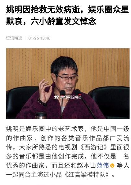 去世的姚明是我国著名作曲家,1948年生人,辽宁营口人士,是中国一级作曲家,主要成就是大胆地将京剧曲调融入歌曲,是中国戏歌的开山领路人。