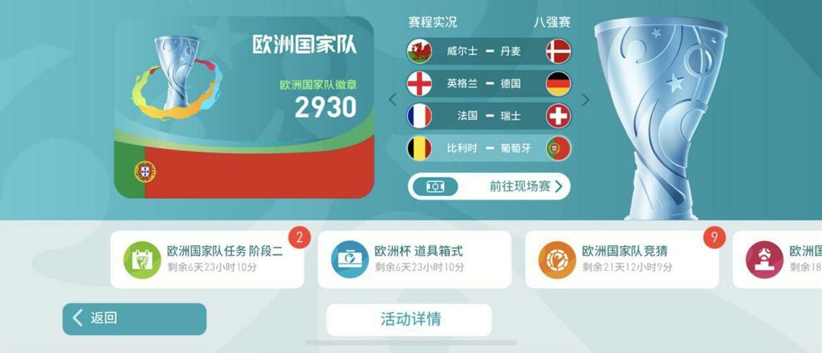 欧洲杯足球赛是全球范围内最具有影响力和知名度的足球比赛之一,每一次的比赛都吸引了无数的球迷前来观看。面对如此盛大的赛事,想必很多球迷都想要及时收看比赛的直播。那么,有哪些欧洲杯直播软件可以让我们实时获取比赛最新的消息呢? 首先,我们可以选择国内的足球直播软件。如酷狗、虎扑、球迷之家等APP,这些软件都提供了热门赛事的直播和重播功能,不仅可以观看欧洲杯的比赛,还可以获取积分榜、赛程表等相关信息。此外,这些APP还提供了多场比赛同时播出的功能,方便球迷们一次获取多场比赛的资讯。 其次,国外的电视直播软件也值得我们考虑。如ESPN、BBC等国外的体育频道都提供了欧洲杯的直播服务,在这些平台上,不仅可以观看比赛,还可以获取更加详细和权威的比赛分析和评论。虽然这些软件需要一定的VPN支持才能够使用,但是只要有一定的科学上网技巧,相信并不会影响大家收看欧洲杯直播。