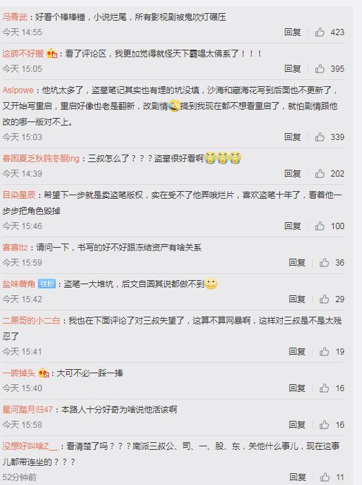 对此,剧组方便说朱老师的时间太紧张了,协调不过来,但是朱一龙的粉丝觉得朱一龙费劲没有得到应有的回报,替他鸣不平,于是就有了南派三叔被骂的故事了。 ![]() 下面是网友透漏的剧本,从剧本来看,其实江子算一开始就有原来的戏份,并不是说朱一龙时间紧张协调不过来。 ![]() 所以,网友就开始骂南派三叔了,骂他的原因有很多比如: 1、“不珍惜自己的作品 随意给别人乱翻拍 只拿钱不管事”。 2、“因为爱之切恨之深。恨他不好好写书,拍电视剧,毁了很多读友的心。把盗墓商业化,不好好写书,埋下的伏笔没有结果。” 3、“挖坑不填,小学五年级盗墓全看完了,后来入藏海花啥的看完就是没有后文,当初盗墓帖子里be很多直接给我干emo了,而且那几本书三叔也没后文了很烦退坑了,后来又出来电视剧也是半截那种”。。。 ![]() |