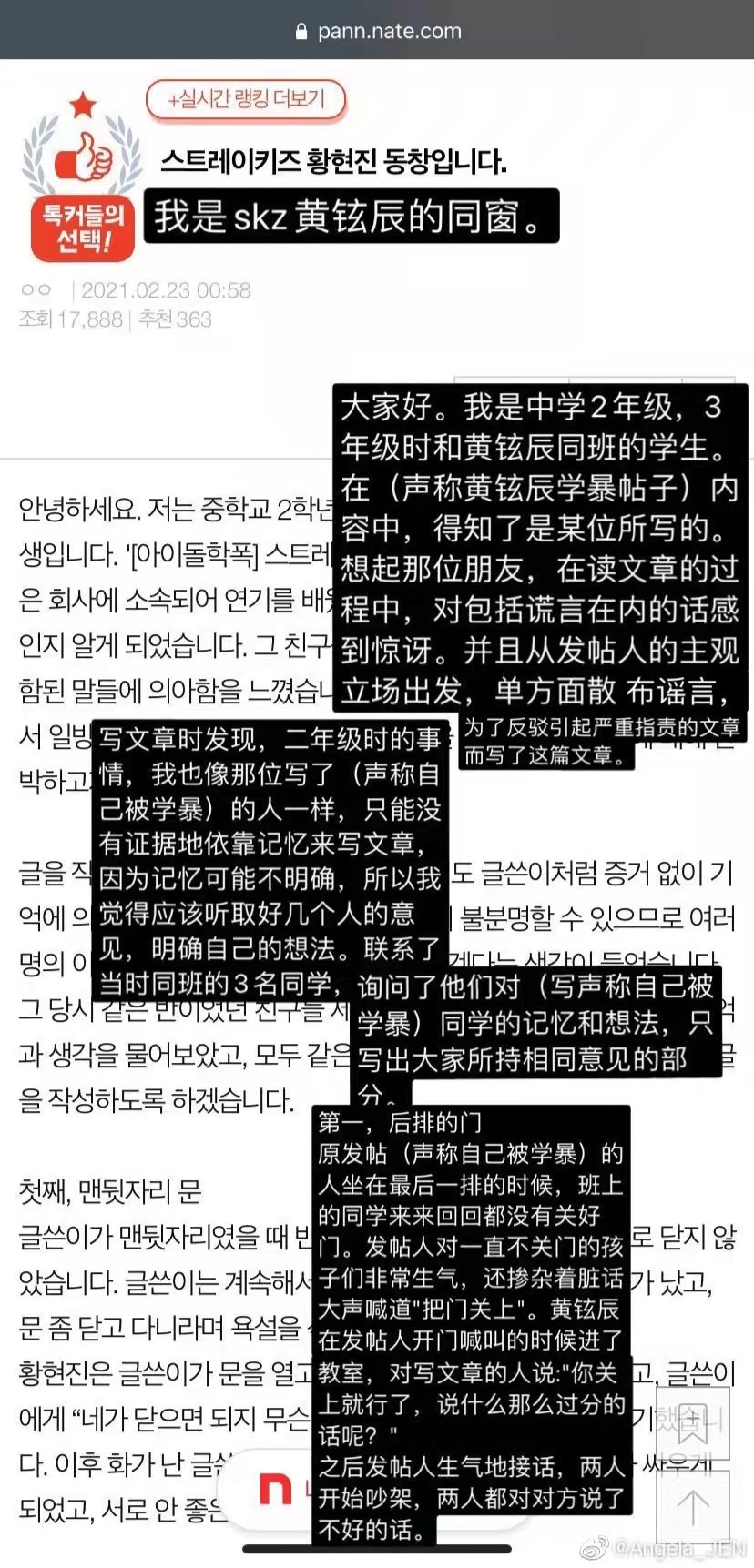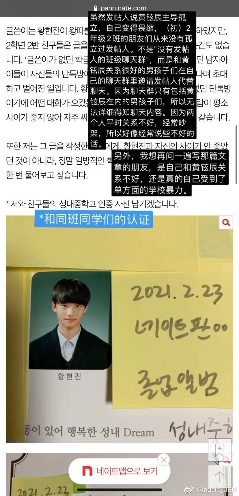 2021年2月22日铉辰被韩网爆料国中时期发生霸凌事件,JYP娱乐随即于23日凌晨发表声明表示:正与相关人员多方面确认中,爆料内容大多未属实,并会针对散布恶意谣言采取法律措施 ![]() 根据最终查实的情况来看,黄铉辰霸凌是假的,具体如下: