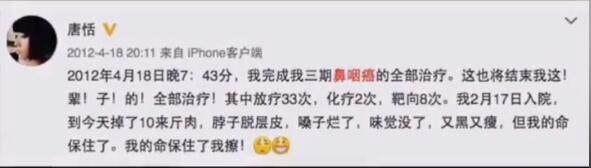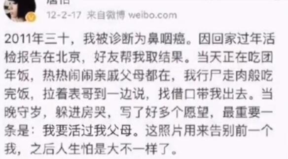 就在事业扶摇直上时,命运却给她开了一个天大的玩笑。2011年大年三十,她回家过年,北京的朋友帮她取了体检报告,没想到确诊鼻炎癌,消息如晴天霹雳。