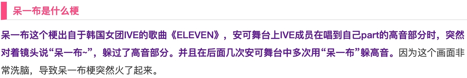 现在比较活跃的五代团,有(G)I-DLE、izone、ITZY和IVE等,其实izone 是有登顶的可能性的,但可惜的是,这是一个限定团,很早就解散了,再加上一些负面传闻,让这个团没有登顶,而IVE女团中,就有两位izone的成员,她们就是张元英、安宥真,因此有izone小分队之称,因此在这个团刚出道的时候,也吸引了不少网友的目光。 IVE女团是在2021年出道的,这是韩国STARSHIP Entertainment 经纪公司五年来推出的首支女团,组合成员除了张元英和安宥真外,还有金秋天、LIZ、直井怜和李贤瑞,一共有六位成员组成,但可惜这个团高开低走,出道后成绩并不理想,除了一些死忠粉外,几乎没有人认为IVE女团有登顶的可能。 其实IVE女团成绩不理想的原因,和她们的作品质量有关,她们的出道单曲专辑《ELEVEN》,创造了韩国女团出道唱片最高初动记录,也是这首单曲,让“呆一布”这个外号广为流传。在安可舞台上,《ELEVEN》中有一部分是高音,组合成员直井怜躲过了自己的高音部分,而是对着镜头说“呆一布”,后来好几次她都这样,在韩语发音中,呆一布是“dive”的发音,这个是IVE女团粉丝的名字,因为太过洗脑,所以呆一布梗流行起来。 ![]() |
