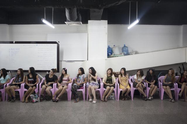 在仰光的“才艺和模特中心”,一群年轻的女孩正在等待在课堂中展示自己的走秀水平。