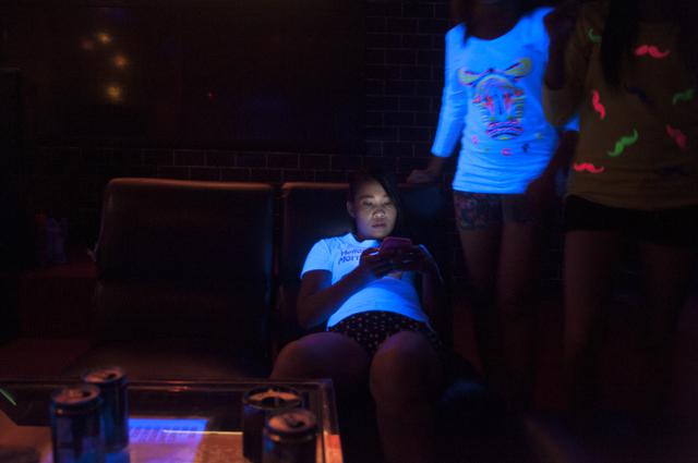 在仰光的一家酒吧,一名女孩正在查看手机,并等待同伴们去下一个场地进行表演。
