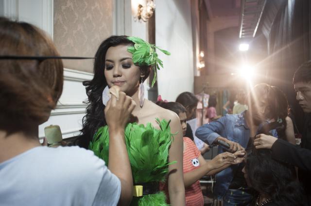 在2014“缅甸世界小姐”选美大赛开始前,一名参赛者正在对自己的妆容进行最后的整理。