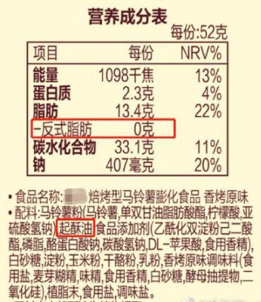 这意味着,即使标示0,食品中可能依然存在反式脂肪。凡食品标签配料表中标注食用植物油、精炼植物油、植物油脂、氢化植物油、起酥油、植物奶油的,都含反式脂肪酸。买饼干、起酥面包、方便面、膨化食品、薯条、泡芙、蛋黄派等食物,一定要擦亮眼睛。