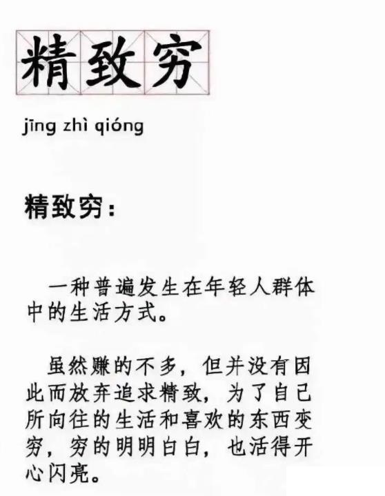 “精致穷”强调的是“穷”,你虽然过的很精致,但是你可能是赚多少花多少才达到了这个“精致”的状态,现在很多月光族年轻人就属于精致穷,用几个月攒下来的工资买一部爱疯手机,在外看其来很光鲜,在家吃泡面度日; “穷精致”强调的是“精致”,但是你这个精致让人看起来一点都不高大上,甚至看起来有点滑稽可笑;精致穷的人一定是“很穷装精致”,但是“穷精致”的人未必一定穷,可能TA的品味不行,比如暴发户一类的没文化的人,带着大粗金链子,带着手串,自己觉得过着“精致”的人生,实际上给外人的感觉是一种“穷精致”的状态,就是精致的一点都不美、精致的很匮乏、很没内涵、很“穷”(这里的穷不指的是金钱方面的贫穷,可能指的是精神世界方面的穷)。 ![]() 有很多人不建议精致穷,也有人觉得没有错。 毕竟,每个人的消费观不同,没什么对错之分,只要自己开心和别后悔就好。但要远离消费主义陷阱,更要避免盲目盲从消费,现在已经不是降级的问题,恐怕是挣扎跌落的问题,所以能省就省点,兜里有点余额,什么时候都不慌。
